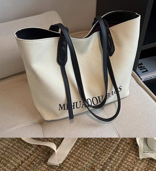 Shop custom canvas tote bags for women. Large capacity, stylish letter-printed design, perfect for shopping or casual outings. Available for bulk orders.